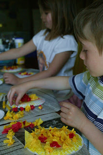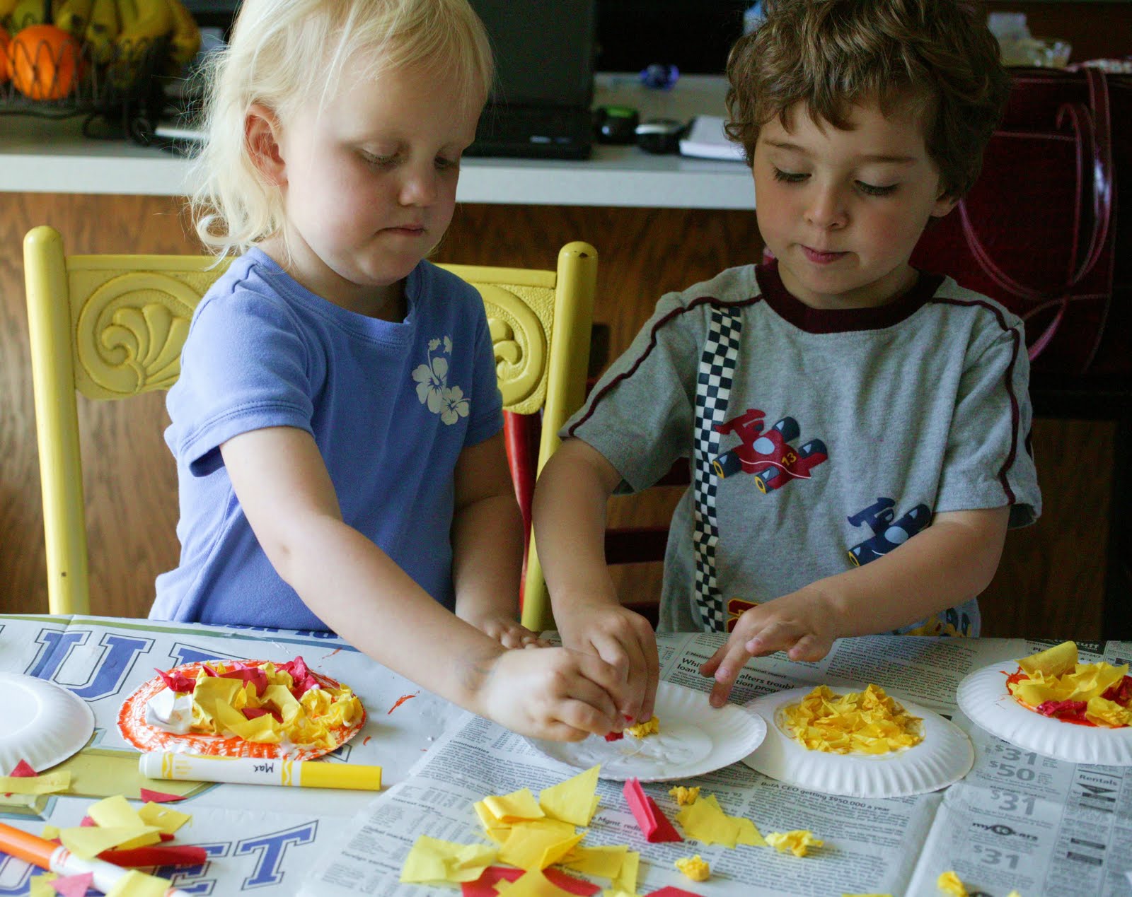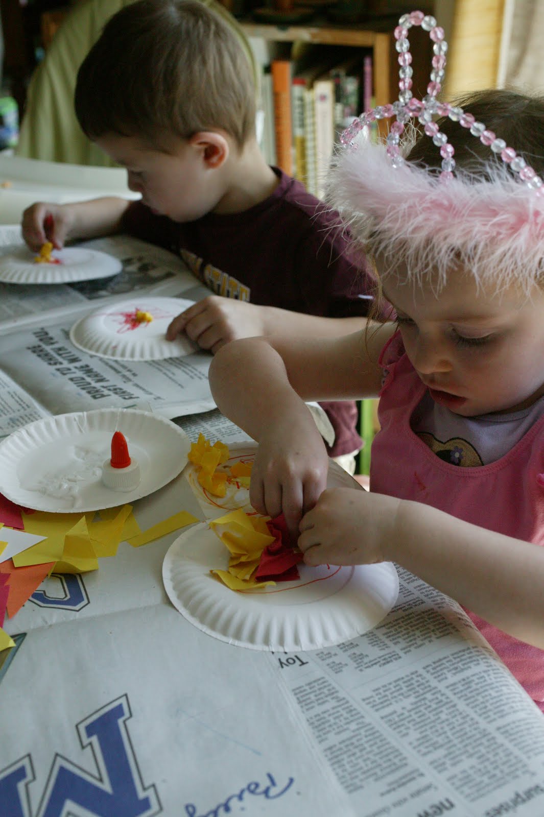 Cut small squares of tissue paper in red, orange and yellow. We tried to use paper scraps, but they really do not stick well. Have the children squish the tissue paper, dip it in glue and then stick it to their plates. Repeat until plates are covered.
