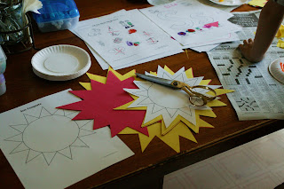 While the kids are gluing, cut out sun shapes from craft paper. I found a sun template online but it was too small (you want it to be larger than your plates by at least 2 inches on each side) so I used the template, but cut far away from the lines. Each child will need two.
