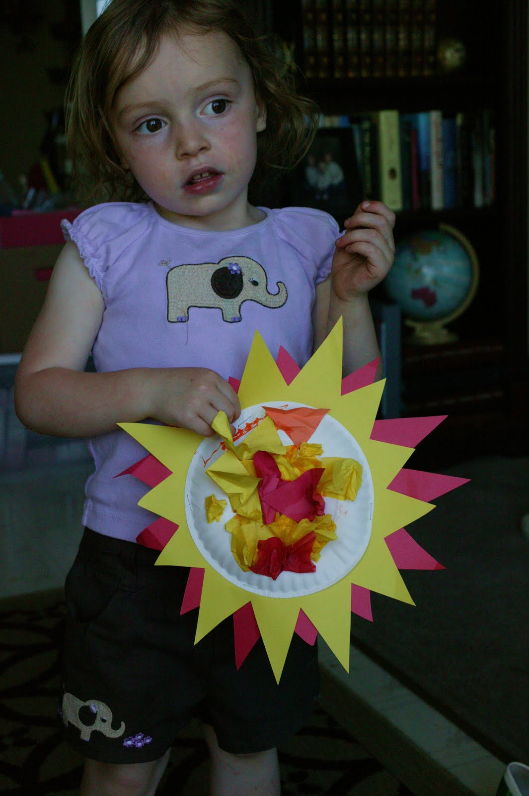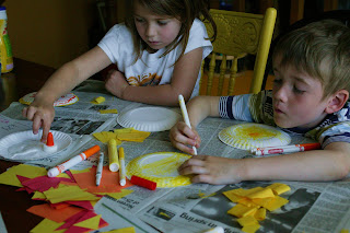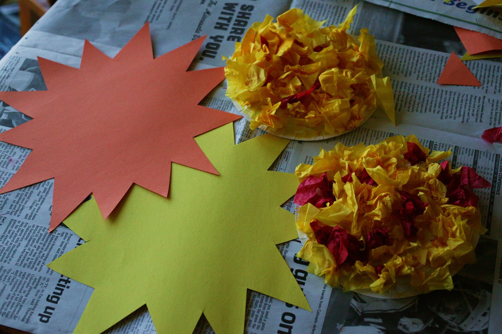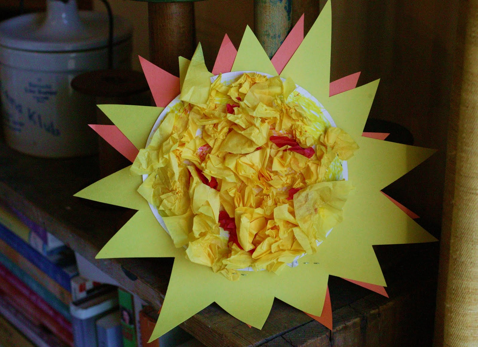 Give each child two small paper plates turned upside down. Have the children color them to look like the sun. I set out yellow, orange and red markers.