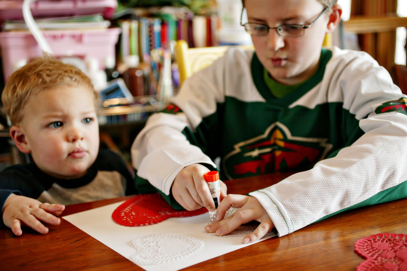I gave each child a white piece of cardstock and some heart shaped doilies. The kids each decided on their own design to make with the hearts.