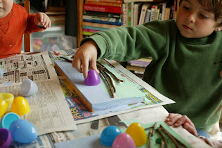 Give each child some cardboard - a shoe box lid or something along those lines. Cut up a whole bunch of egg cartons to make different kinds of flower shapes.