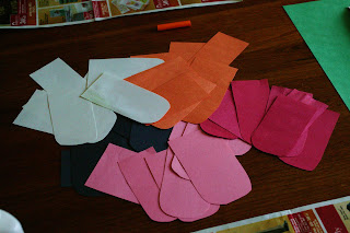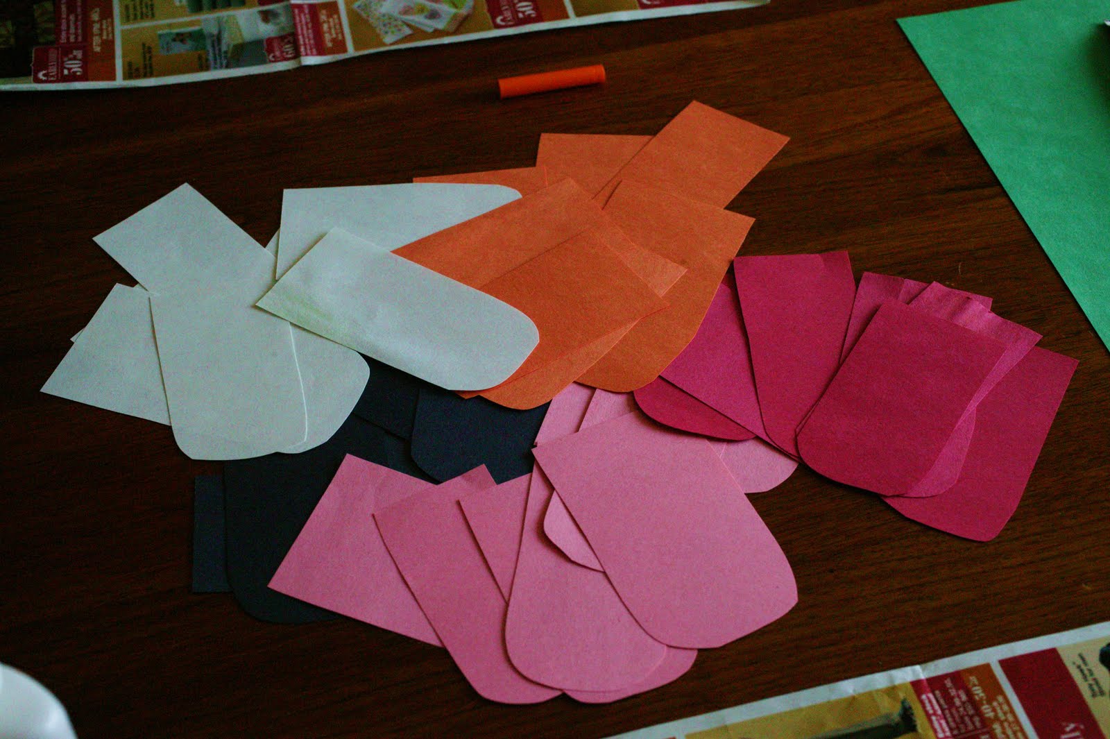 In the meantime, we are going to make birds. Cut out some rounded rectangles from different colors of construction paper. Let each child choose three.