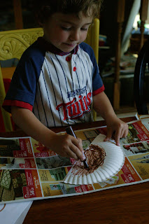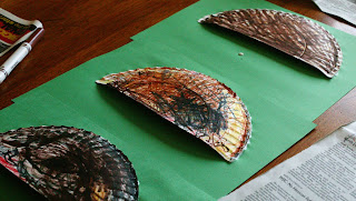 Start by cutting paper plates in half. Give each child one half and have them color it brown. You can use crayons, markers or paint - we went with markers and used a mixture of brown, black and yellow. You want to cover the entire plate.