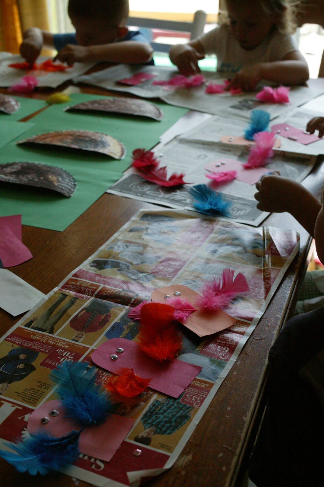 Next give each child six feathers and have them glue them on the sides of their birds. They will also need three triangles (cut from construction paper scraps) to glue on as beaks.