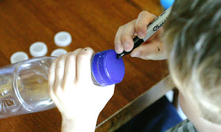 Have each child find a cap that fits their bottle and four matching caps for the feet.