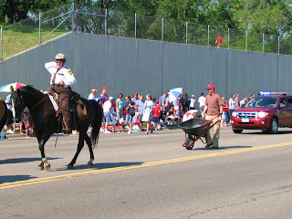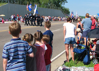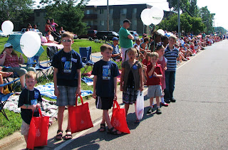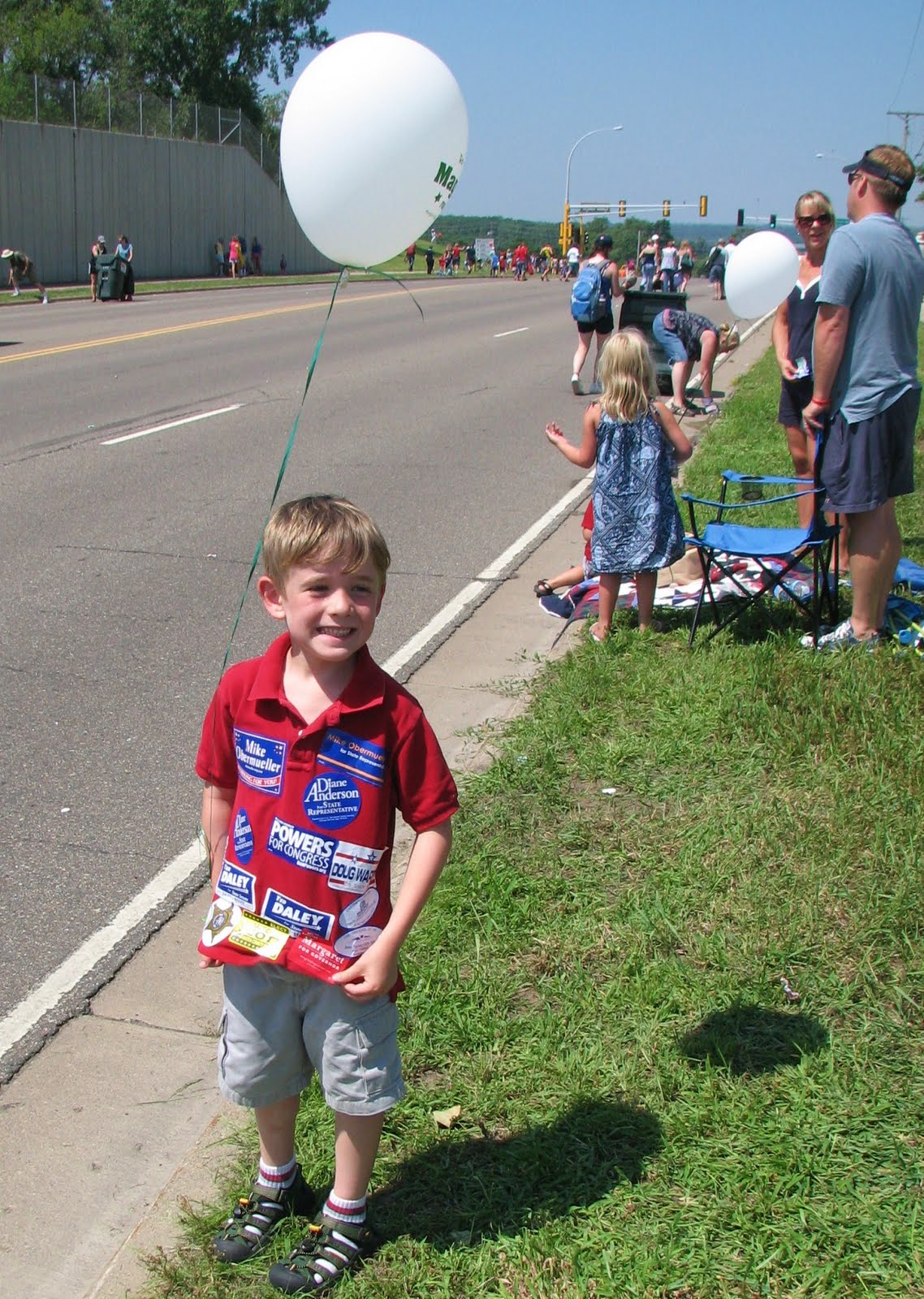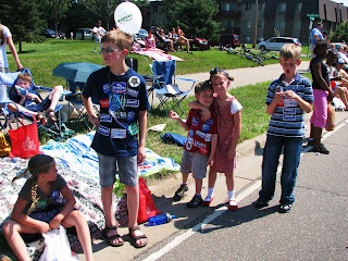 The Eagan Parade was Saturday morning and this year we met up with friends from church and found a spot at the beginning of the parade route. We wore red, white and blue and the kids perched on the curb waiting for the candy and water bottles thrown into the crowds during the parade. We cheered Emily as she marched by in the Eagan High School Band and my kids accepted every political sticker offered to them. It was HOT, but really fun this year.